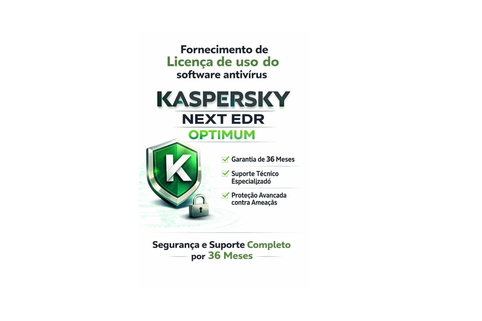 Fornecimento de licença de uso do software antivírus Kaspersky Next EDR Optimum, com solução avançada de detecção e resposta a ameaças (EDR), garantindo maior segurança para ambientes corporativos.