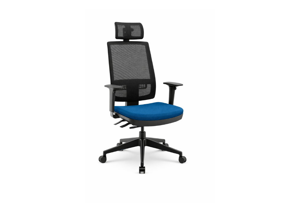 CADEIRA GIRATÓRIA COM BRAÇOS REGULÁVEIS ENCOSTO ALTO TELADO E APOIO DE CABEÇA