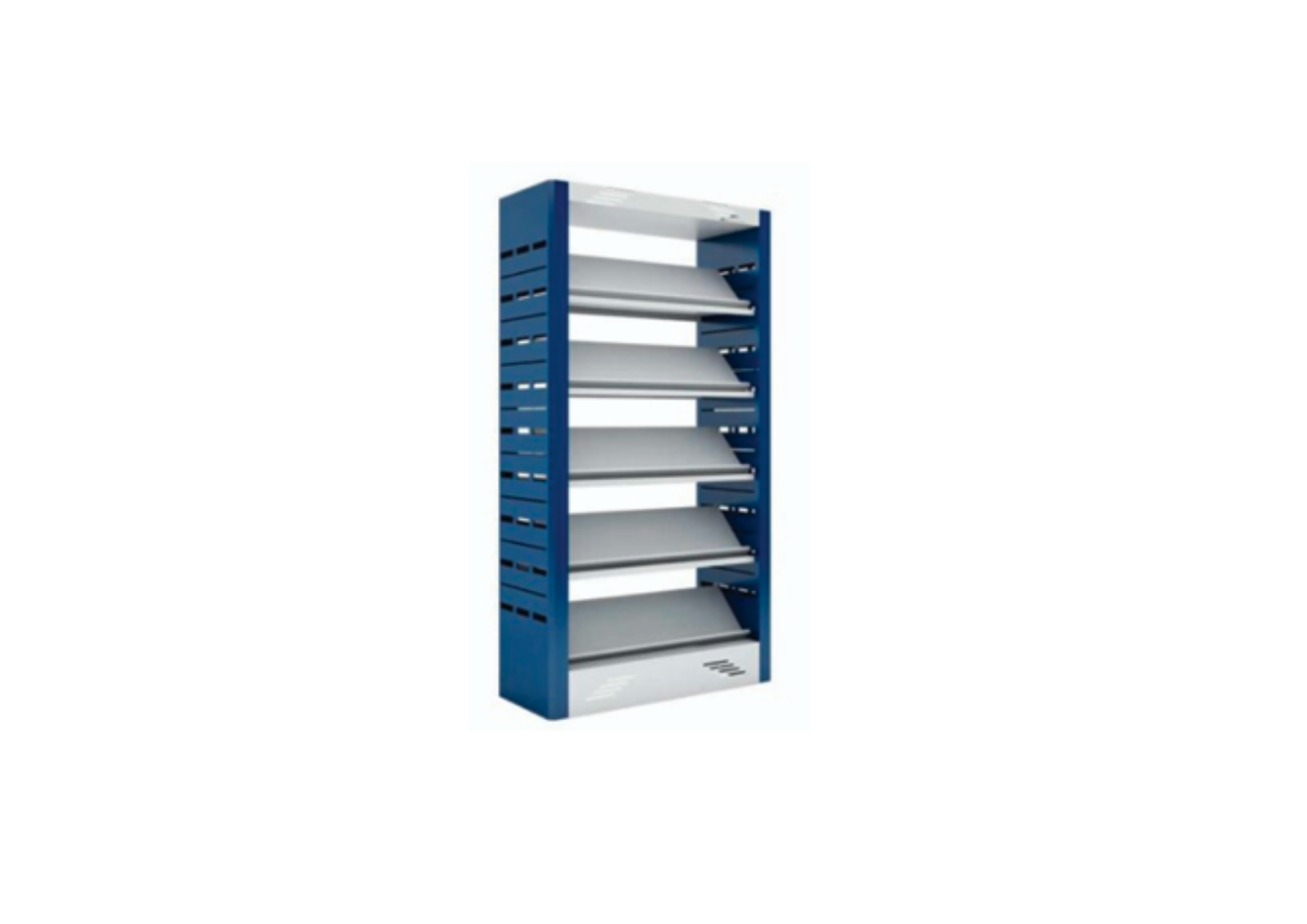 Estante de Biblioteca Expositora de Livros Dimensões: 1980 × 1000 × 445 mm (A × L × P) Material: Aço SAE 1008 a 1012, tratado e com acabamento antimicrobiano.