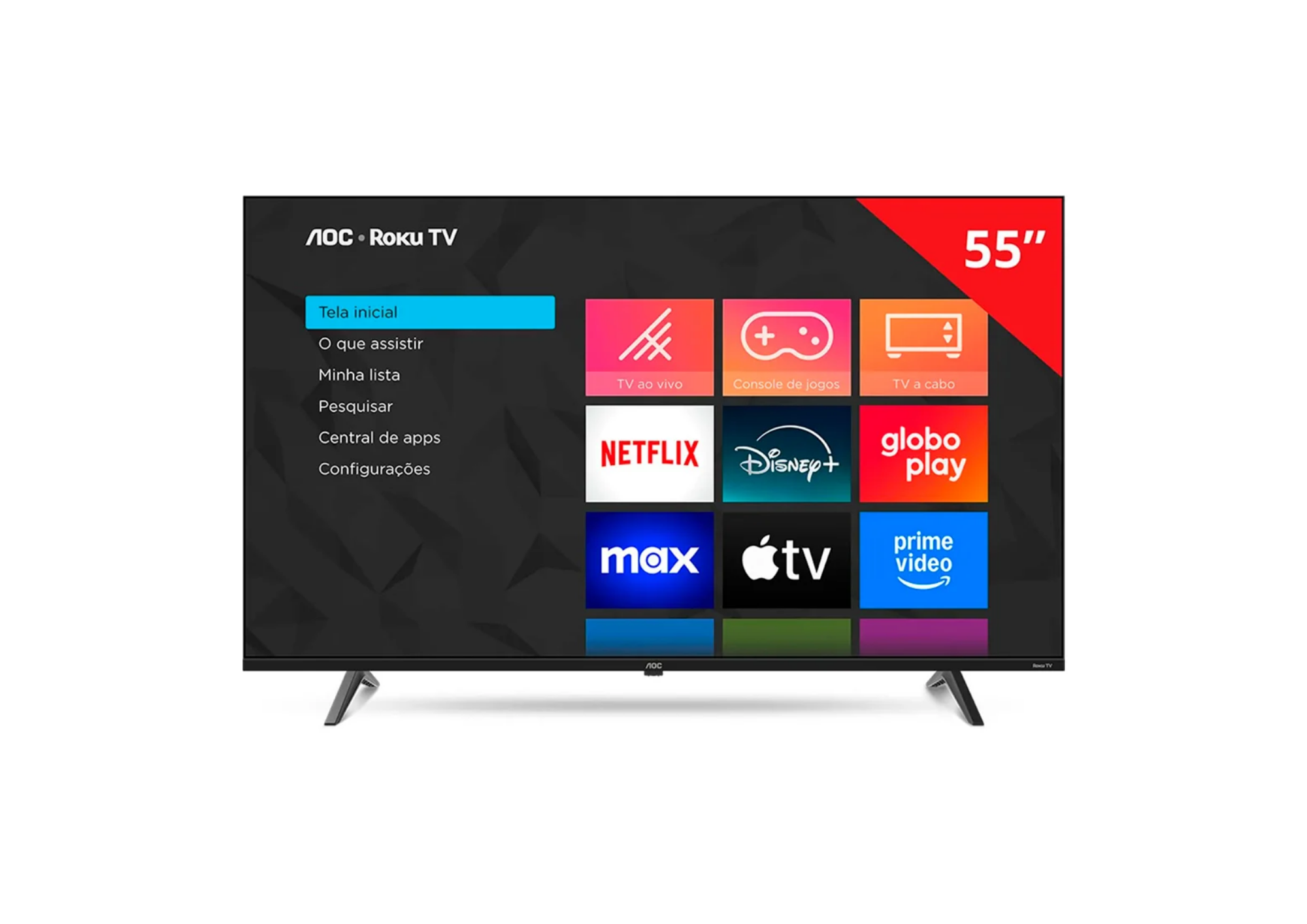 Apps populares disponíveis: Netflix, YouTube, Prime Video, Disney+, HBO Max, Apple TV e outros por meio da Roku Channel Store.