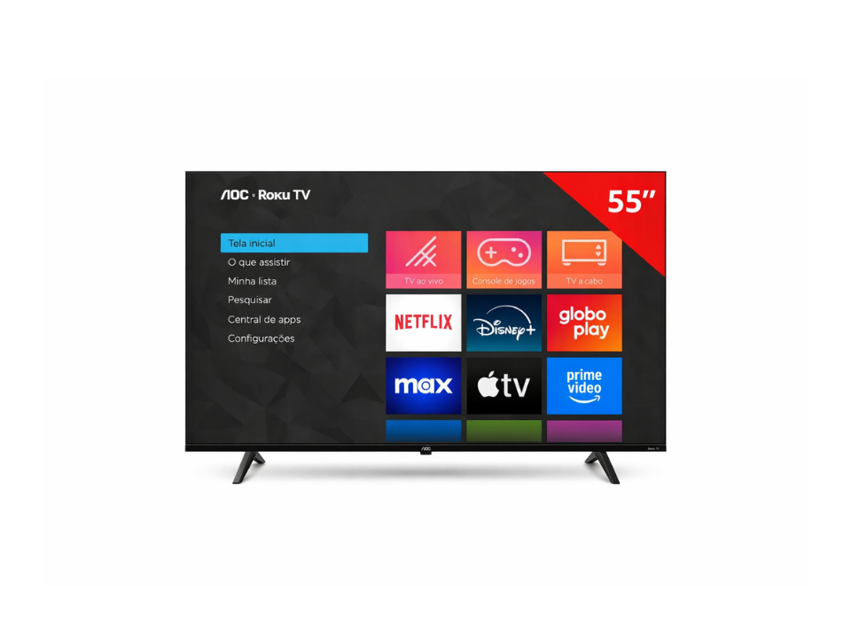 Apps populares disponíveis: Netflix, YouTube, Prime Video, Disney+, HBO Max, Apple TV e outros por meio da Roku Channel Store.